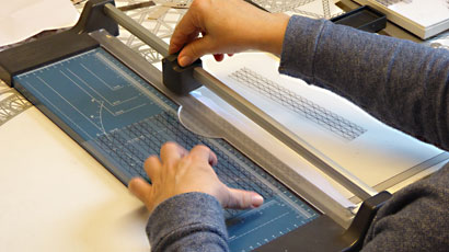 Med en enkel skärmaskin delar man overheadfilmen till det som skall bli fackverken. De har 4 sidor plus en limflik.