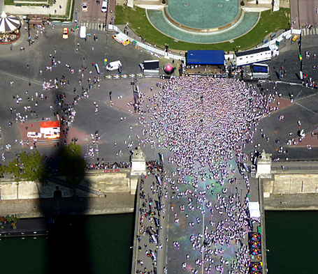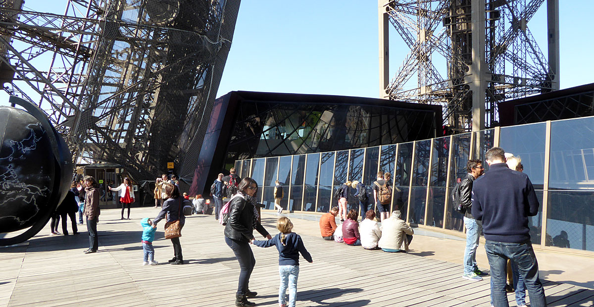 Översikt över våningsplan 1. Höjd över marken 57 meter. På våningsplanet finns tre byggnader placerade i hästskoform med öppning mot parken för place de Mars mot SydOst. Byggnaderna är nya och omdesignade mellan åren 2011-13 Här finns tre olika restauranger, samlingsrum för konferenser etc.
